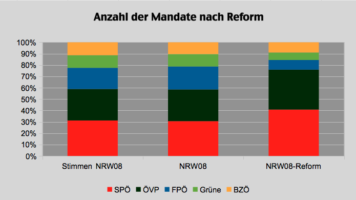 Update, 13.4.: Wenn man die Bezirksergebnisse der 2008er-Nationalratswahl einem System zu Grund legt, das die Hälfte aller Mandate ohne einen Ausgleich auf der Bundesebene in Einerwahlkreisen vergibt, kommt das heraus: Eine massive Verschiebung zu Gunsten der großen Parteien. Sie würden 75% der Mandate mit 58% der Stimmen machen, die FPÖ dagegen mit 17% der Stimmen nur 9% der Mandate. Letzteres könnte man zwar im Sinne der politischen Sympathie gut finden – im Sinne der Abbildung des tatsächlichen Wahlergebnisses im Parlament aber nicht. Die 39% von SPÖ und BZÖ hätten nach diesem Modell für eine Mandatsmehrheit im Parlament gereicht.