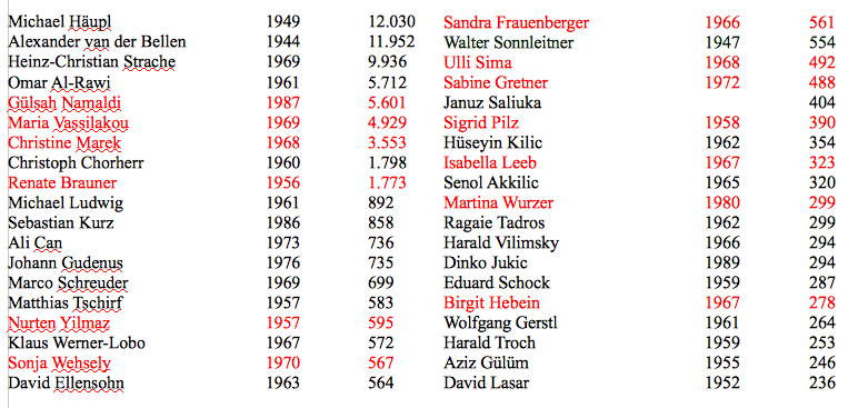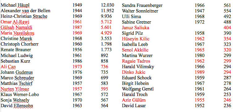 Und hier sind alle KandidatInnen mit Migrationshintergrund rot markiert – auch eine Gruppe, die laut Sebastian Kurz bei den Vorzugsstimmen besonders gute Ergebnisse erzielt.