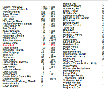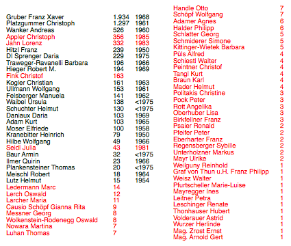 Großzügige Vollerhebung. Die Innsbrucker ÖVP hat das radikalste Direktwahl-Modell angewandt, das ich in Österreich bisher kenne. Hier die Ergebnisse meiner großzügigen Vollerhebung. Warum großzügig: Die Geburtsdaten von Menschen, die bei einer Innsbrucker Gemeinderatswahl 3 Vorzugsstimmen bekommen haben, sind normalerweise nicht herauszufinden. Dort, wo ich die Informationen nicht bekommen konnte oder wollte, hab ich die Vorzugsstimmen jeweils den Jungen zugeschlagen.