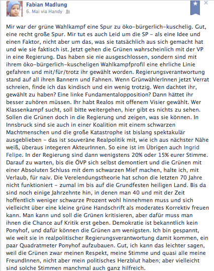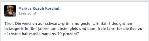 Ich halte es für zutiefst vernünftig, mit der einzigen Großpartei in Tirol herauszuverhandeln, was geht. Wenn das, was ich heute in der Tiroler Tageszeitung lese stimmt, haben die Grünen mit den Bereichen Naturschutz, Umwelt, öffentlicher Verkehr, Soziales und Frauen so viele Ressortkompetenzen, wie nirgendwo anders in ganz Österreich. Auch wenn die beiden KoalitionspartnerInnen alles andere als eine innige Liebe verbindet: Ich halte es für vernünftig, wenn die stärkste Partei in der Landeshauptstadt mit der stärksten Partei im Land zusammenarbeitet.