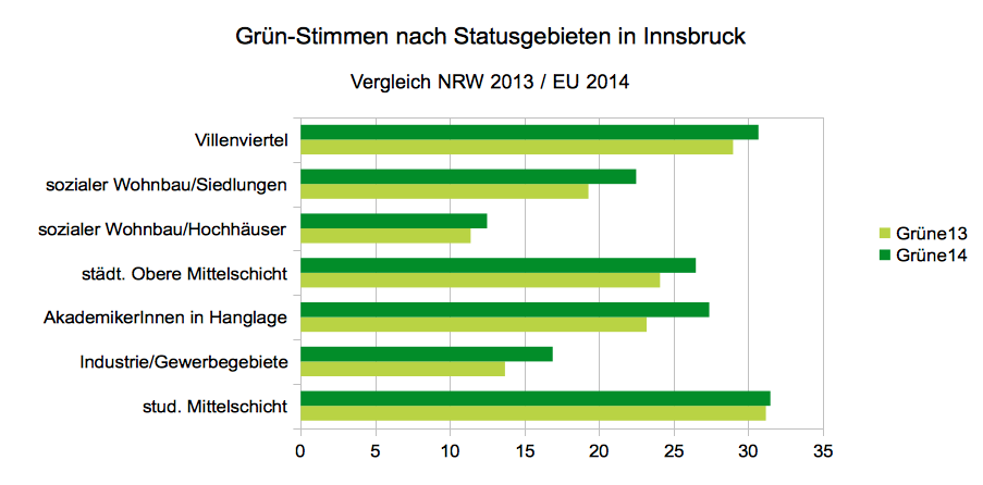 Diese Zuwächse werden üblicherweise mit Generationenwechsel und Bobos und Gentrifizierung erklärt. Es ist ja auch einfacher für die älter werdenden Politologen, soziologisch klingenden Allgemeinplätze von sich zu geben, anstatt sich in die Daten einzulesen. Für Innsbruck stimmt das nicht mehr. Längst wachsen die Grünen in den ArbeiterInnenbezirken stärker, als in studentischen Vierteln: Im Vergleich zwischen Nationalratswahl 2013 und EU-Wahl 2014 haben die Grünen in den sozial schwächeren Milieus um 16,5% ihrer Stimmen zugelegt, in sozial stärkeren nur um knapp 8% ihrer Stimmen. Hier gibt’s alle Daten dazu.