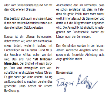 Aber nicht nur der Wörgler Bürgermeisterin ihre Gemeindezeitung liest sich, wie ein Werbemittel der FPÖ. Genosse Edgar Kopp ist mit absoluter Mehrheit regierender Bürgermeister in Rum und hat zuletzt von sich reden gemacht, als er seine permanente Weigerung, in Österreichs größter SPÖ-regierten Gemeinde westlich von Salzburg Flüchtlinge willkommen zu heißen, so untermauerte: