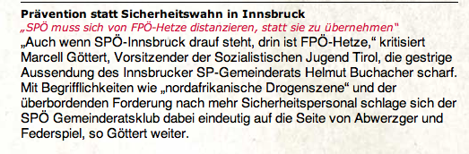 Ich möchte das Engagement jener, die etwa in Menschenrechtsfragen positiv von sich reden machen, nicht unterschlagen: Es gibt einige rote Gemeinden in Tirol, die selbstverständlich Flüchtlinge aufnehmen, die Parteijugend sammelt im Parteihaus Kleiderspenden für Flüchtlinge und der oben angesprochene Parteichef bemüht sich redlich darum, sich verbal von den Rechten in den eigenen Reihen abzugrenzen. Die Jungen in der SPÖ kämpfen redlich gegen die Rechten in den eigenen Reihen, aber ihr Befund zum Innsbrucker SPÖ-Rechtsblinker Helmut Buchacher sagt eigentlich alles.