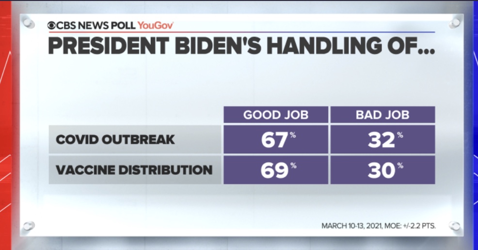 Joe Biden und sein Team sind am besten Weg, einen großen Vertrauensvorschuss bei den AmerikanerInnen zu gewinnen. Die hohe Zustimmung von fast 70% zur Covid-Politik und spezifisch zu seinem Impfplan ist angesichts der sonst sehr harten 50/50-Aufteilung der politischen Zustimmung auf Democrats und Republicans, noch einmal höher zu bewerten. Und auch die 1.000en Dollar pro Familie aus dem erst letzte Woche beschlossenen Covid-Paket kommen dieser Tage auf den Konten fast aller US-AmerikanerInnen an. Auch hier, ca 70% Zustimmung in der Bevölkerung zum Paket, dem kein/e einzige/r RepublikanerIn imSenat zugestimmt hat. Biden und die Democrats brauchen einen hohen Vertrauensvorschuss.