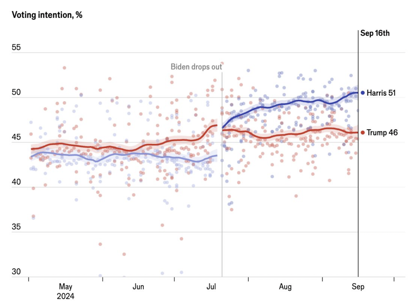Trotzdem: Wir haben jetzt, eine gute Woche nach der Debatte und seit dem demokratischen Parteitag, ein stabiles Rennen. Nichts, was in den letzten Wochen passiert ist, hat das dramatisch verändert. Die Auf- und Abwärtsbewegungen in den Umfragen sind minimal. Die Umfragen sind stabil. Die wenigen Ausreißer sind republikanische Umfrageinstitute, die immer nur vor Wahlen auftauchen und bei denen der Verdacht besteht, sie wollen selber Politik machen. Und die knappe Umfrage der New York Times, deren Zahlenchef selbst gesagt hat, die folgenden Tage würden zeigen, ob es sich bei der damals überraschenden knappen Trump-Führung um einen Ausreißer handelte: Es war so.