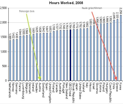 Wär ja zu schön, wenn der Druck auf Josef Pröll für eine Reichensteuer wachsen würde. Angenehmer ist es allemal, nach unten zu treten. Da macht der Kunstgriff, dass der Name eines griechischen Milliardärs winzig klein auf der Hängematte steht, auch keinen Unterschied mehr. Klar ist: die GriechInnen sind ein faules Pack, das uns fleißigen ÖsterreicherInnen auf der Tasche liegt. Aber halt, da war doch was – nämlich die OECD-Statistik über die durchschnittliche Arbeitszeit.